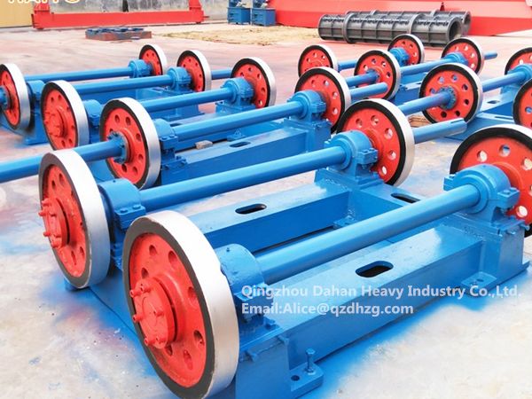 The centrifugal machine is mainly used to manufacture the centrifugal equipments manufacturing the reinforced concrete drainpipes, driving the spinning of the drainpipe concrete pipe mold loaded with some concrete and reinforcing steel with a certain mixing ratio at different speeds, and  the solid phase particles of concrete in steel mould will be centrifugal settling in the steel mould inner surface under centrifuge, meanwhile draining the excessive water, thus forming compacting concrete structure namely reinforcing concrete drainpipe. The machine mainly consists of riding wheels, shafts, bearing block, bearing, V-blet pulley, base and electromagnetic speed-controlling motor.